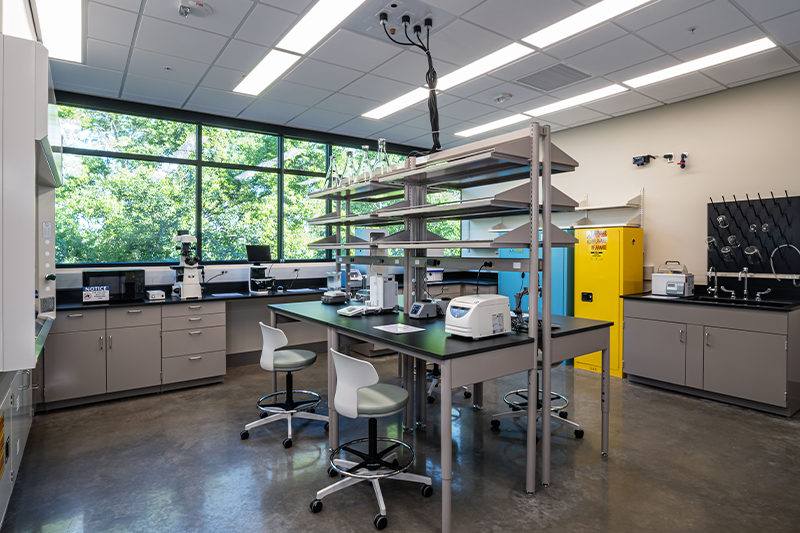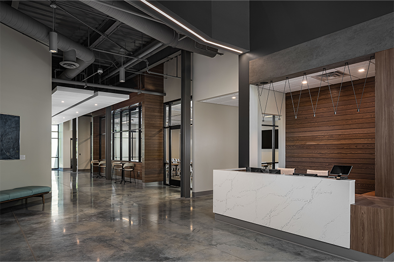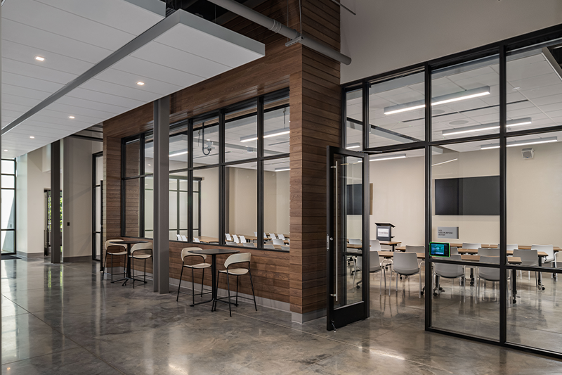 Upon entry, visitors experience visual connections to the conference room, monumental stair, and an elevated patio overlooking the pond. Centrally located support spaces (break room, storage, and restrooms) ensure efficient circulation and access throughout. The result is a highly adaptable and thoughtfully organized facility that fosters collaboration, flexibility, and efficiency for a range of research and innovation tenants.